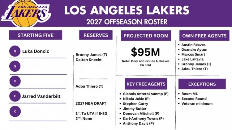 直播吧8月7日讯 今天,薪资专家Bobby Marks盘点了湖人2027年夏天的阵容情况、薪资状况以及27年夏天自由市场上的大鱼。